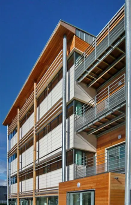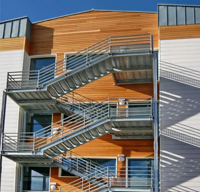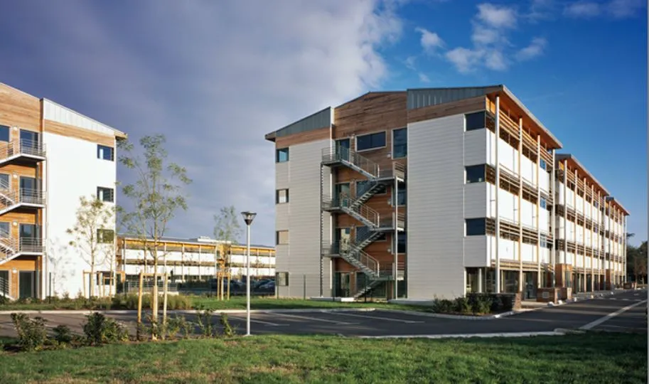 - Façades en ossature bois supportées par des consoles métalliques qui pincent les nez de dalle et s’appuient contre les poteaux béton.